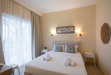 They can accommodate up to 2 adults with two single beds or one double bed, while a baby cot can be arranged. They feature a private balcony with panoramic sea view and a private bathroom with shower.